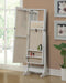 This gorgeous multi-function jewelry Cheval mirror is simple yet practical. At nearly five feet tall, it has sufficient space for reflection and checking your fashion. It opens up to a space with three lower horizontal shelves and plenty of hooks and right holders for necklaces and other precious accessories. A jewelry box built four inches deep protects watches and earrings. The white finish mirror also conveniently tilts to make sure you get your look right.