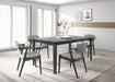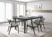 This mid-century modern five-piece dining set offers vintage vibes to any space. Designed with a softly beveled, faux marble top that seats up to six quite comfortably. Along with square shape tapered legs, the tabletop offers a minimal aesthetic to formal or casual gathering spaces. Each of the four chairs invite you to relax, designed with padded backrests and seats in a brown-toned grey fabric, along with a sturdy Asian tropical hardwood frame with straight front legs and flared back legs that extend up into jutted armrests. This five-piece dining table set makes a sleek addition to a space.