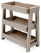 Display your kid's decor with simple style on this shelf accent table. Constructed of solid and engineered woods in a dark metallic gray finish, this table blends easily with their existing bedroom or play space decor. Three tray shelves can be used to show off keepsakes and collectibles, or to keep TV remotes handy.