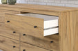 This dresser puts the dream of a casual bedroom retreat beautifully within reach. A warm light brown finish over replicated hickory grain exudes a homey vibe. The smooth-gliding drawers are packed with storage possibilities. It’s a simply relaxed way to achieve the look you want to wake up to every morning.