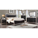 Contrast defines this elegant bedroom: flowing lines are set against straight edges, while the smooth silver finish clashes beautifully with the textured, crocodile leatherette panels. The headboard and footboard have prominent top curves that swoop from left to right, while the legs curve gently outward away from the straight frame of the bed. The same leg shape can be found on the case goods while antique-looking handles exhibit curves as well. Lastly, both the bed and the case goods have crocodile leatherette front panels for that exotic look.