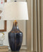 Product Details- Made of indigo and goldtone metal with fabric modified drum shade