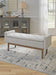 Contemporary style gets practical with this bench. The tufted beige seat cushion is hinged to allow easy access to whatever you need to hide in plain sight. The raised edges give the impression of arms on this cushioned seat while the light brown finished wood legs help it blend with many different modern styles.